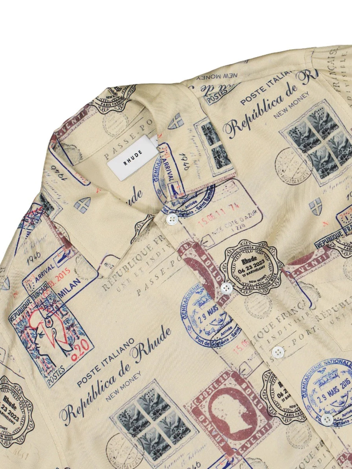 Upgrade your wardrobe with the Rhude Shirt Passport Stamp Beige. Made with the finest materials, this shirt features a unique passport stamp design for a stylish touch. Stay comfortable and make a statement wherever you go. Expertly crafted, this shirt is a must-have for any fashion-forward individual.
